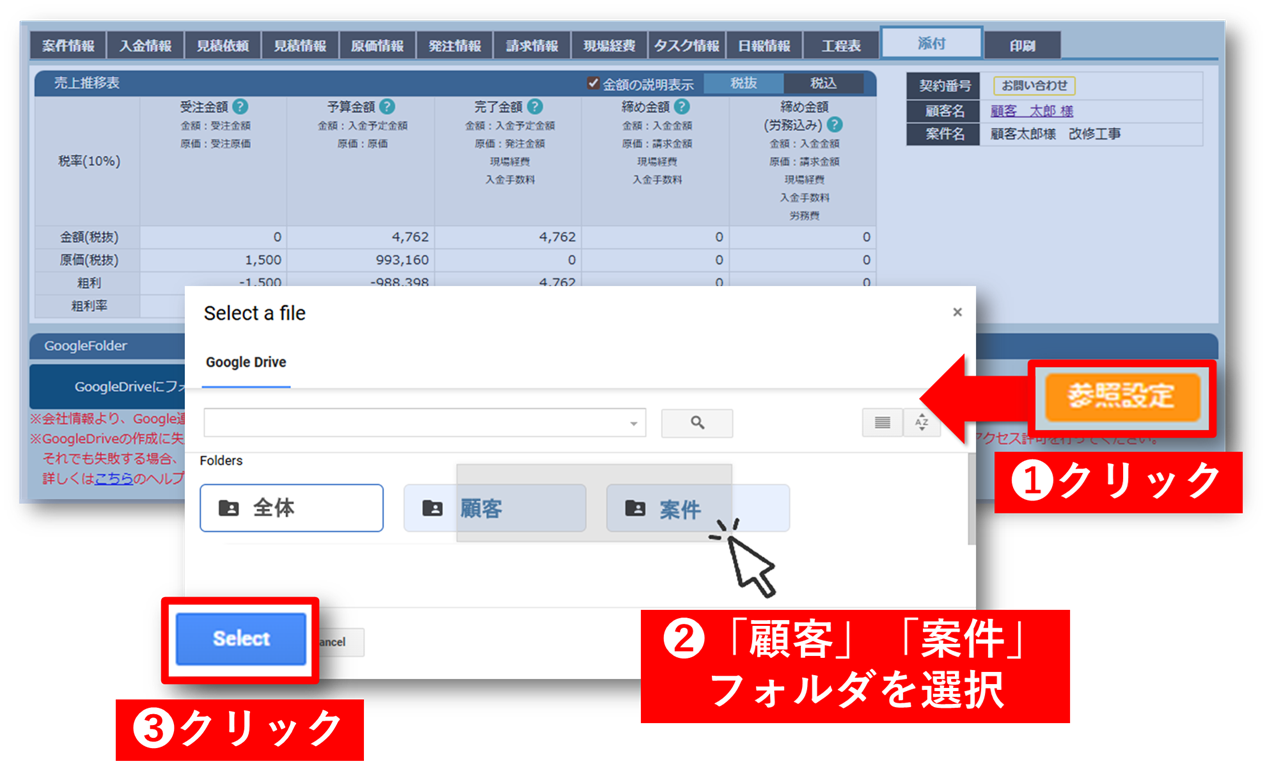 顧客情報及び案件情報の各画面に、「GoogleDriveマーク」を設置します。