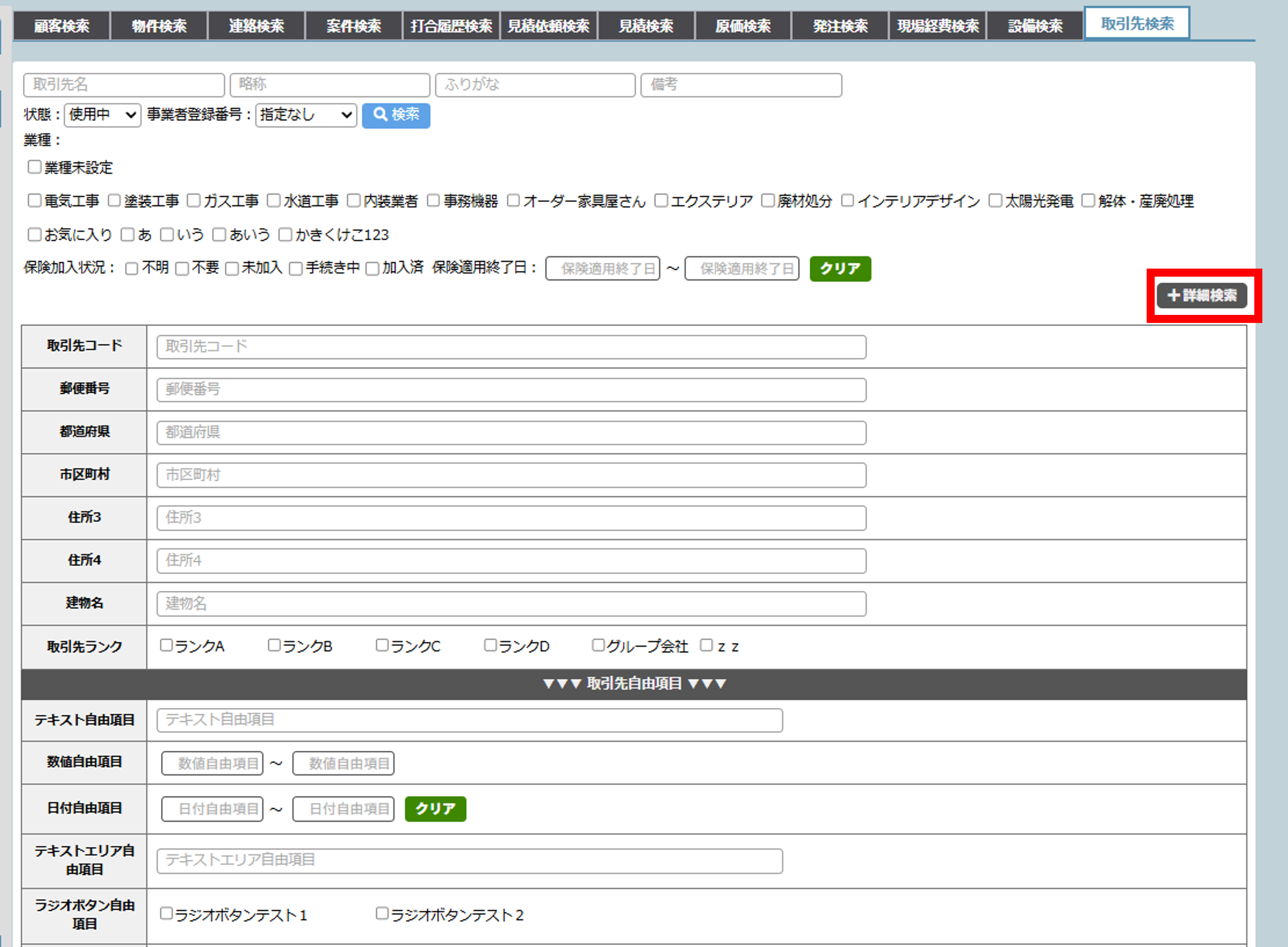 「詳細検索」ボタンから、取引先コード、住所等での絞り込ん検索が可能です。「取引先自由項目」での検索にも対応しています。