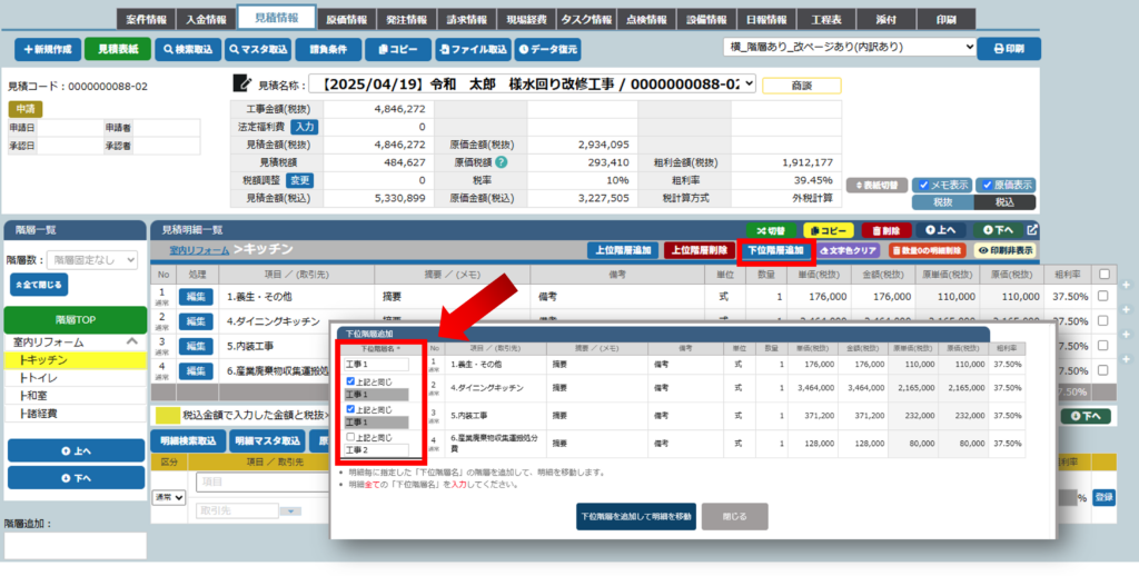 見積書に「階層数」を設定することで、工事内容ごとに分類したきめ細かな見積明細を作成できます。