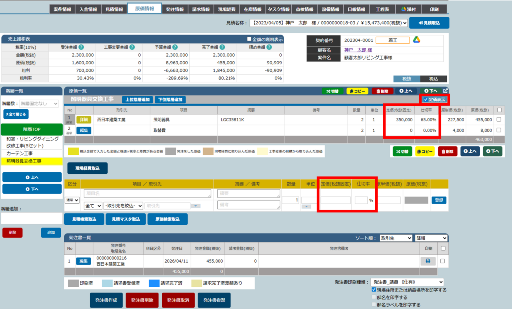 【定価入力】原価明細に「定価金額」と「仕切率」を入力することができます
