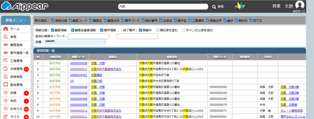 画面上部の検索窓から、串刺し検索(複数のデータベースからキーワードを横断的に検索)ができます。検索可能な情報は「顧客情報/顧客従業員情報/案件情報」です。検索窓に入力した、各種コード番号、名前、ふりがな、住所、TEL番号等と部分一致するデータが検索結果に表示されます。検索結果が1件の場合は、該当した「顧客情報」「案件情報」の画面が表示します。