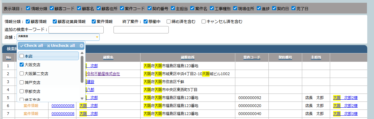 画面上部の「表示項目」に✅チェックされた項目のみが「検索結果一覧」に表示されます。また、情報分類、進捗状態、店舗などの条件を設定することでさらに絞り込みんだ検索が可能です。追加の検索キーワードから、任意の文言での絞り込み検索も可能です。