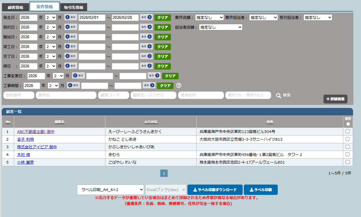 概要:案件情報を検索し宛名ラベルと一覧を出力できます。