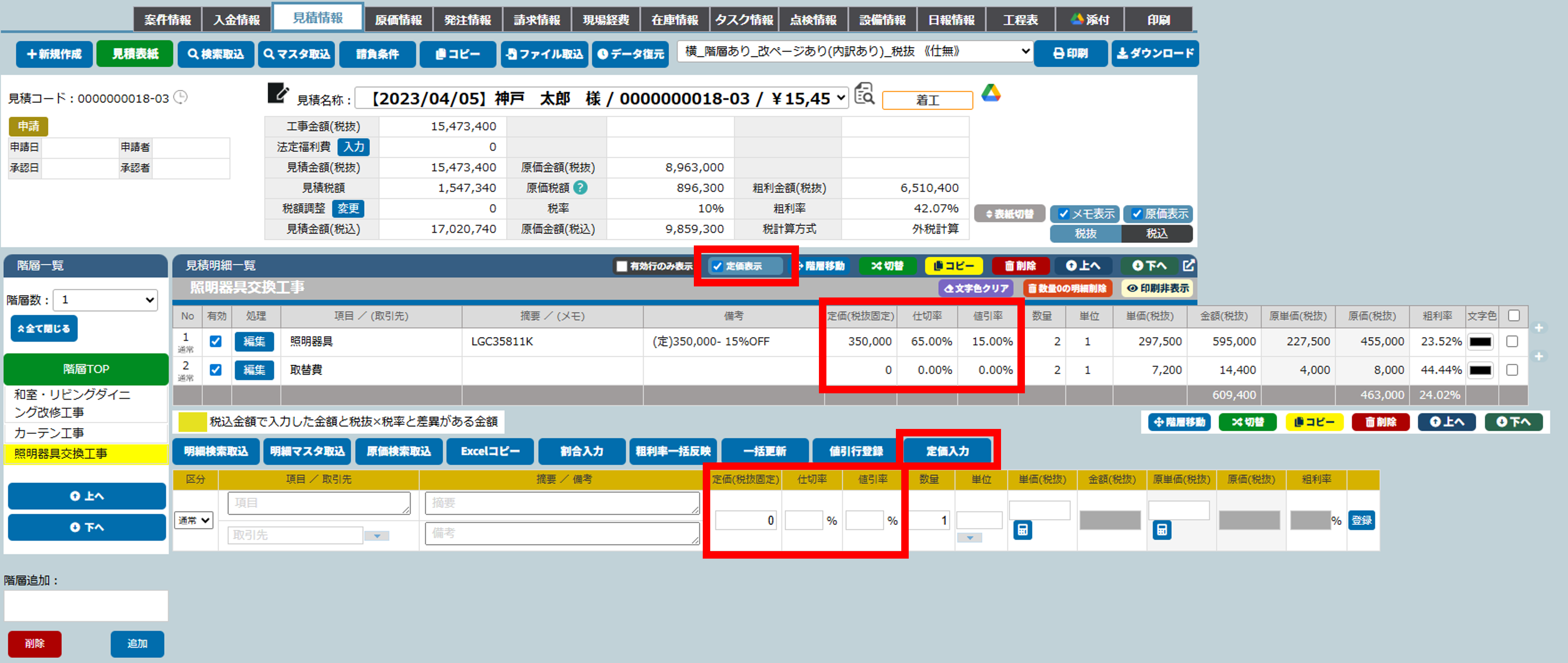 明細登録フォーム、または「定価入力」ボタンから「定価金額(税抜)」金額を入力し、「仕切率」「値引率」を設定してください。設定された「率」をもとに、「原価」と「単価」が自動計算されます。明細ごとの「編集」または「切替」ボタンからも定価入力が可能です。