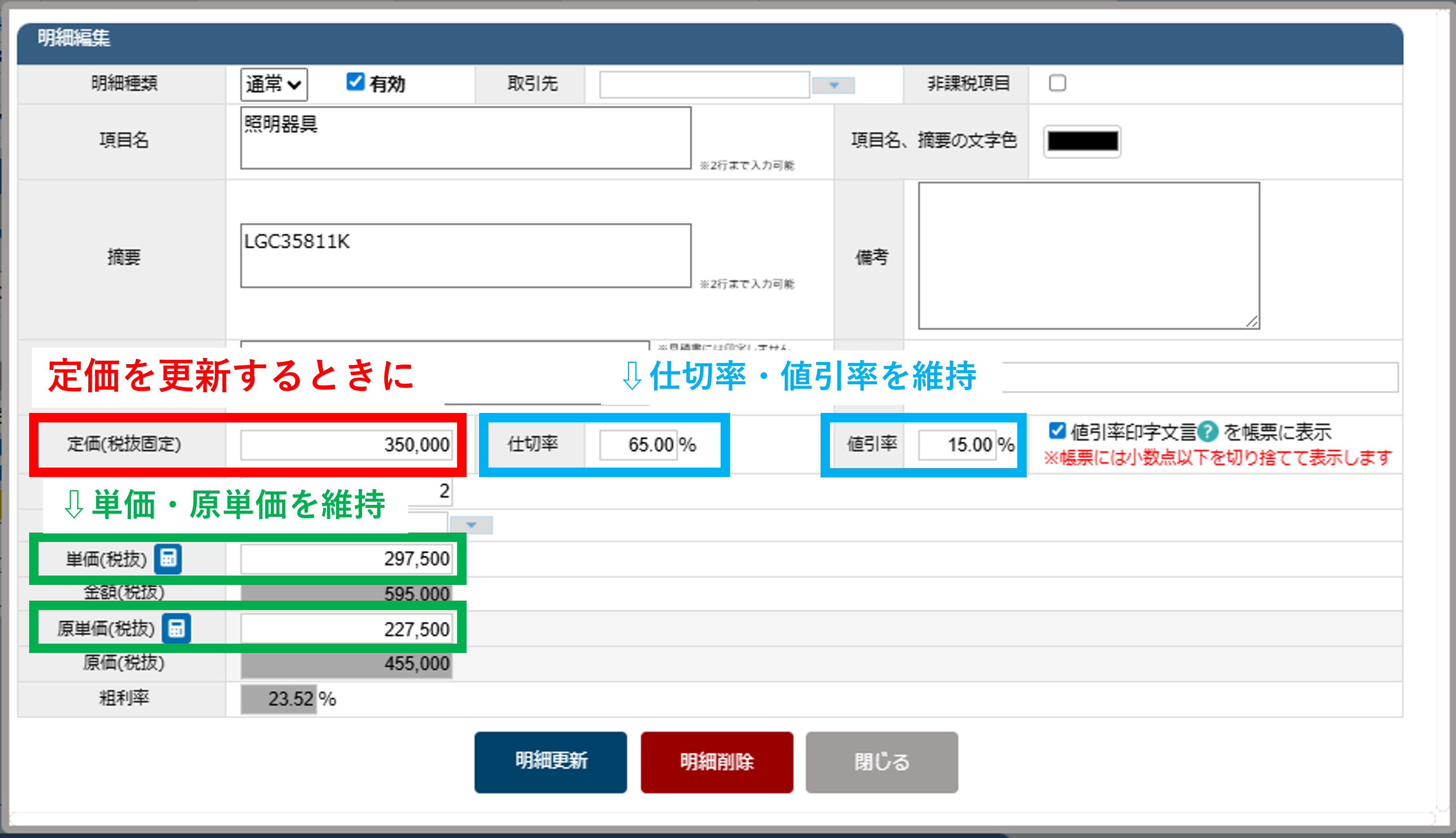 定価に対して「仕切率」や「値引率」を設定して明細を登録することができます。