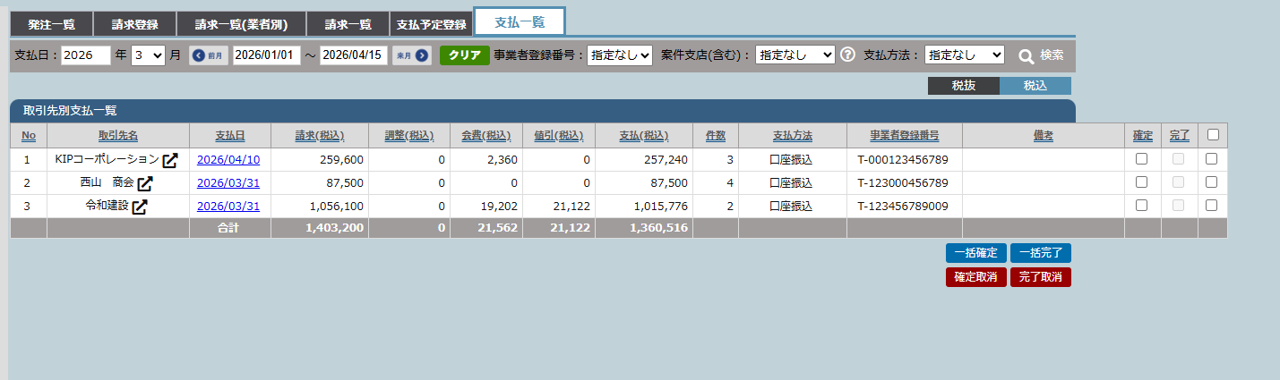 「請求・支払」メニュー「支払一覧」に「一括確定」「一括完了」ボタンから一括処理ができます。