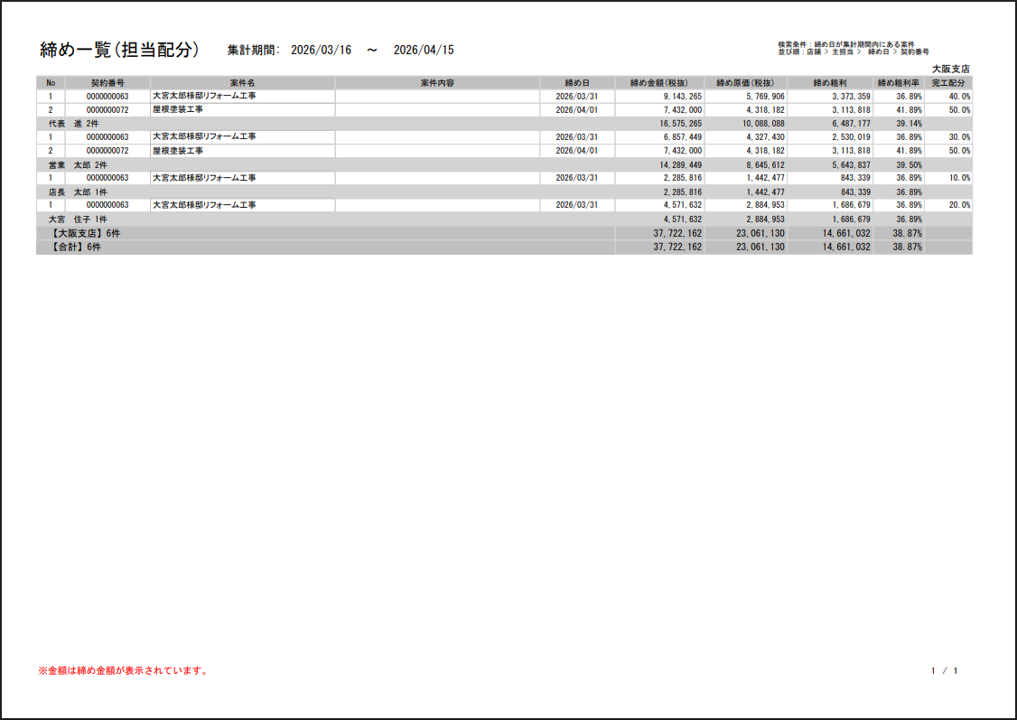 | ・帳票名 締め一覧(担当配分) ・絞り込み条件 締め日が集計期間内にある案件情報 ・グループ 店舗毎に完工配分を反映して集計 ・並び順 店頭→主担当→締め日→契約番号 |