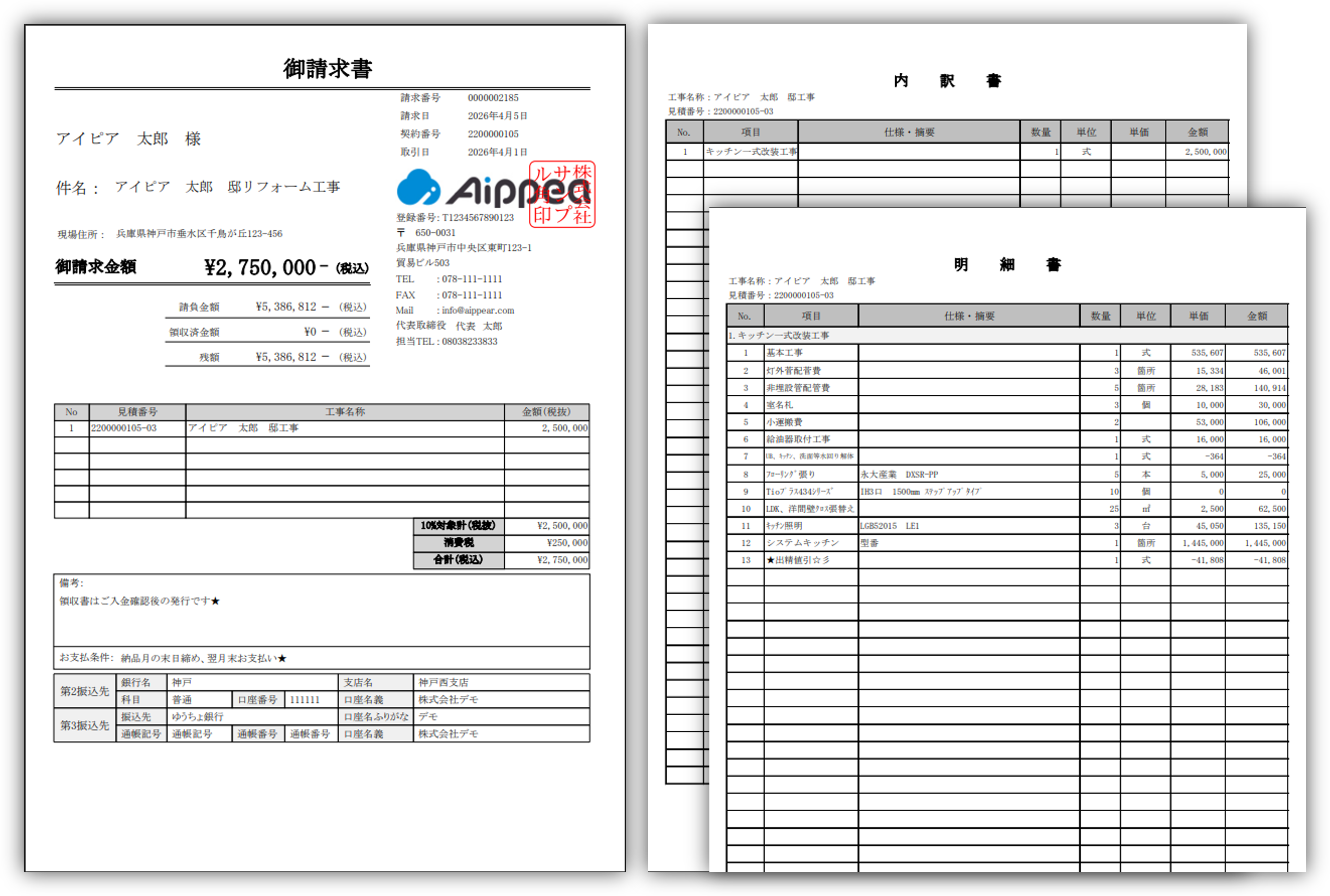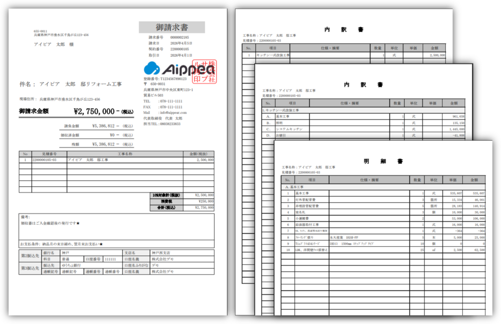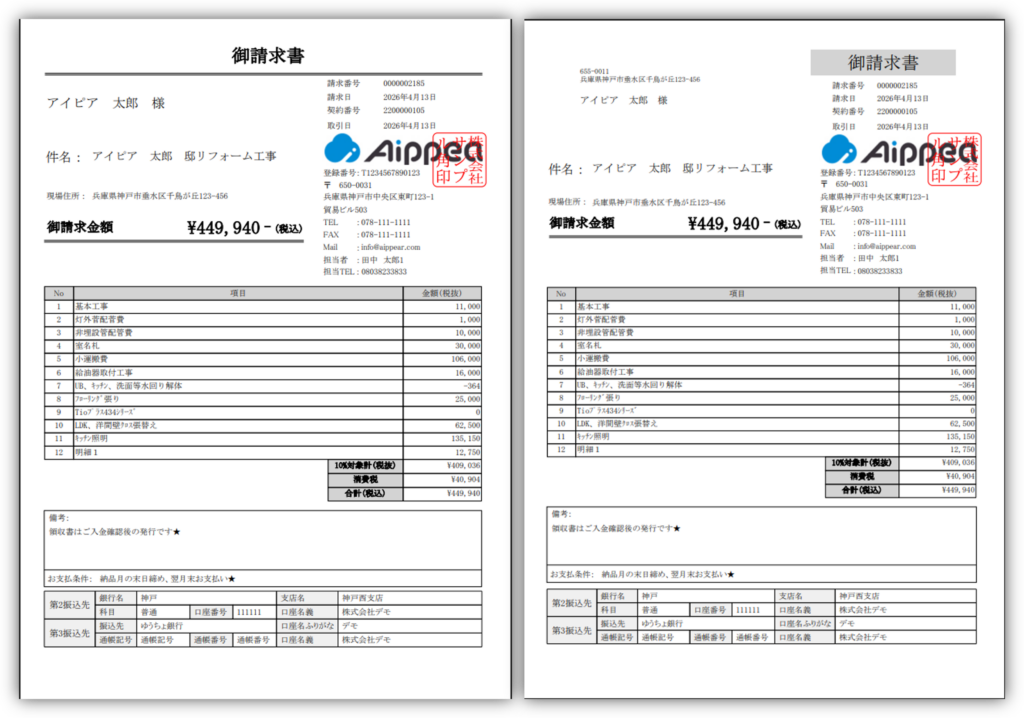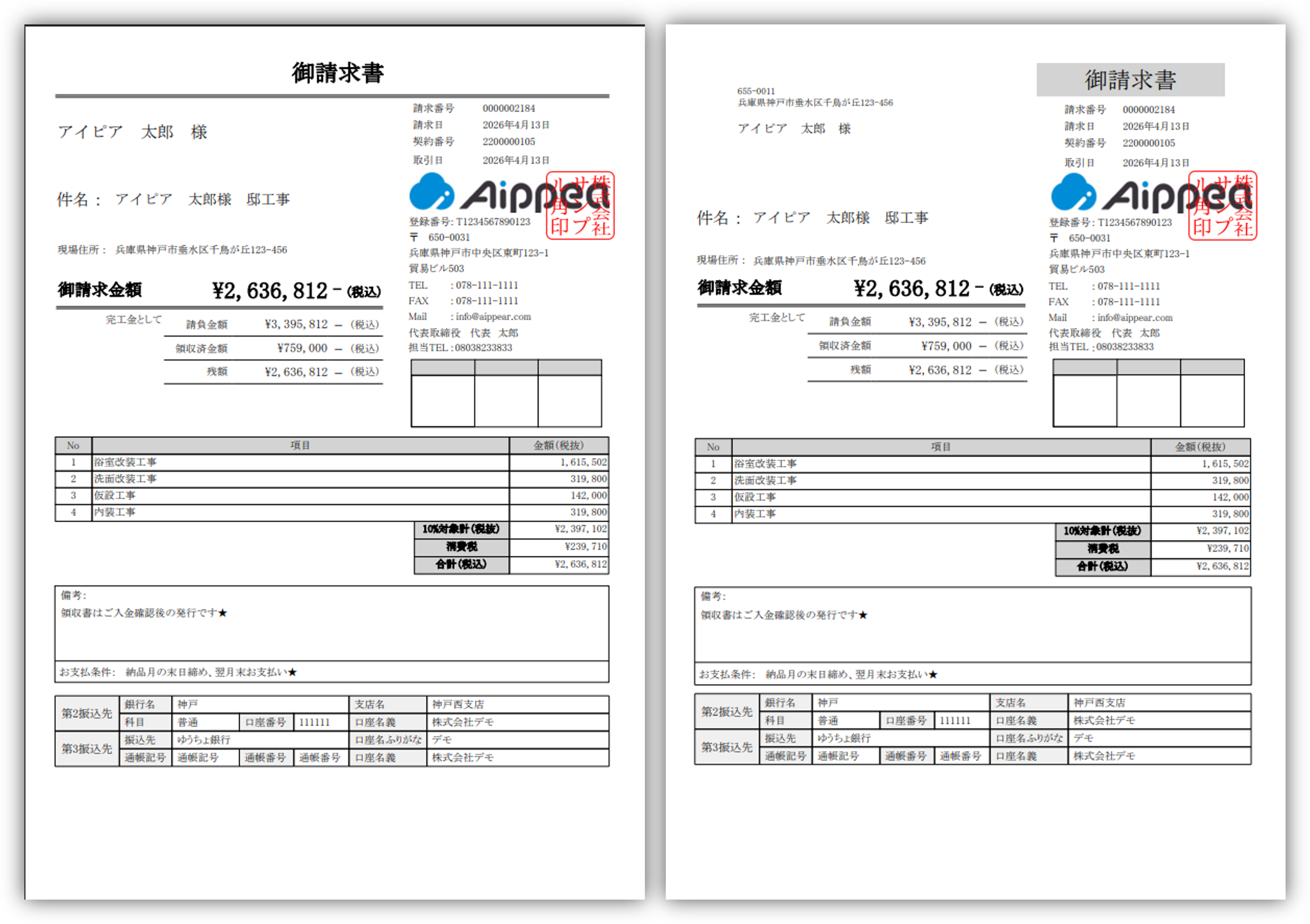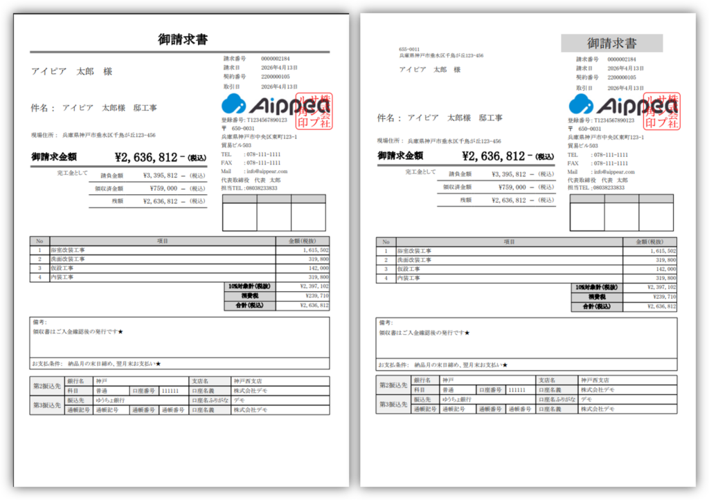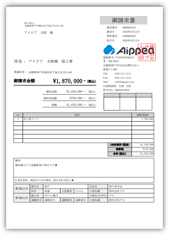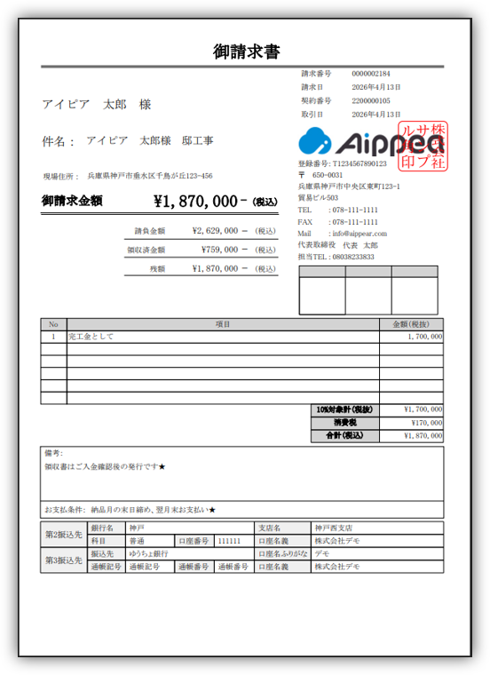 残額(税込) 請負金額(税込)-領収済金額(税込)=残(税込)(※印刷オプション設定)