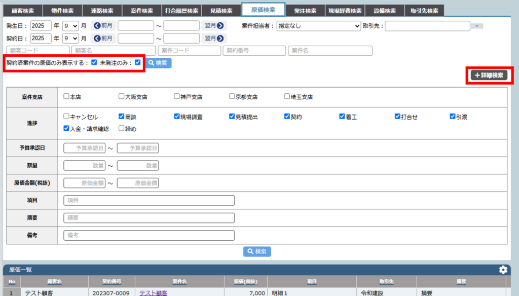 「原価検索」画面で、これまで詳細検索メニューにあった以下のチェックボックスを 画面上部に移動 しました。