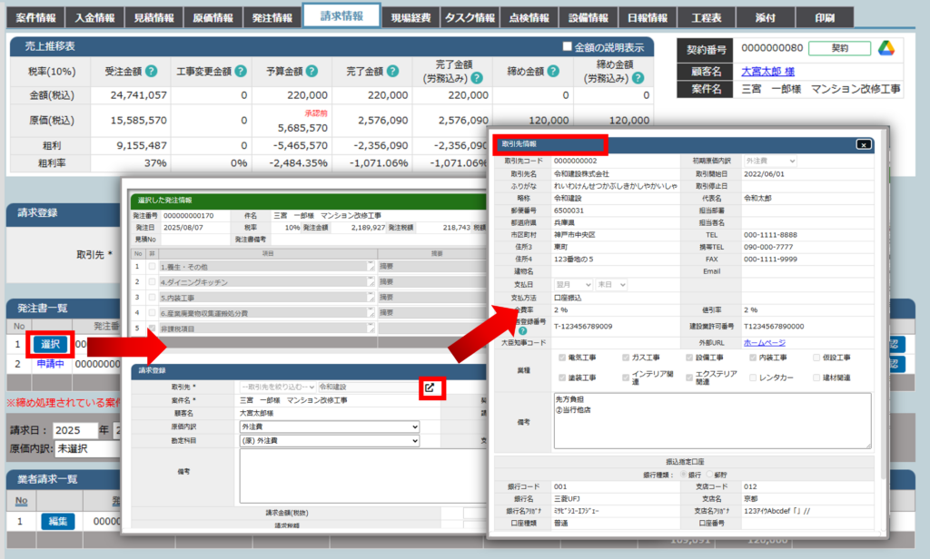 案件情報 | 請求情報 | 選択した請求情報の「取引先名」の横に「取引先情報」のリンクを追加 |