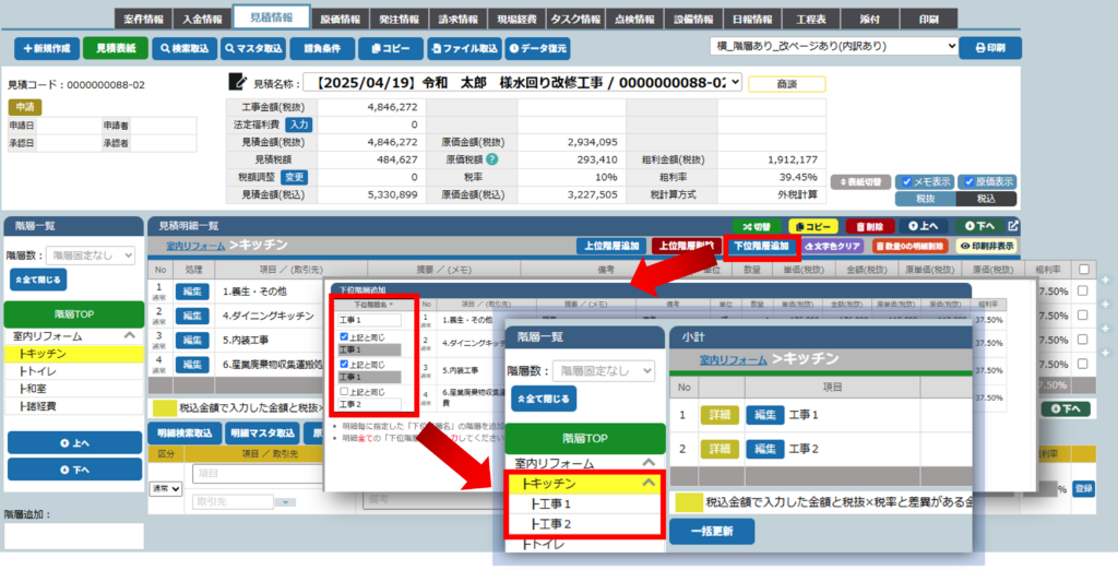 見積マスタ | 見積明細一覧 「下位階層追加」 |