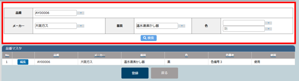 「品番」マスタの画面上部に、検索条件を上部に検索条件を追加しました。