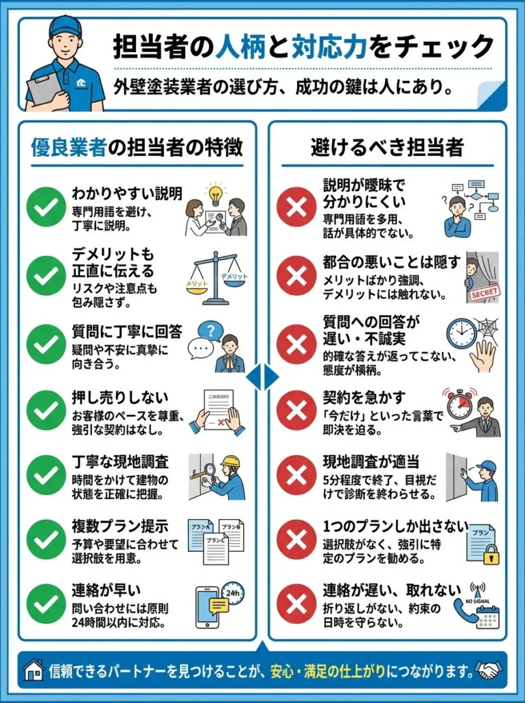 外壁塗装業者を選ぶ際には、価格だけで判断してはいけません。技術力、実績、保証内容など、総合的に評価する必要があります。ここでは、優良業者を見極めるための7つのチェックポイントを紹介します。