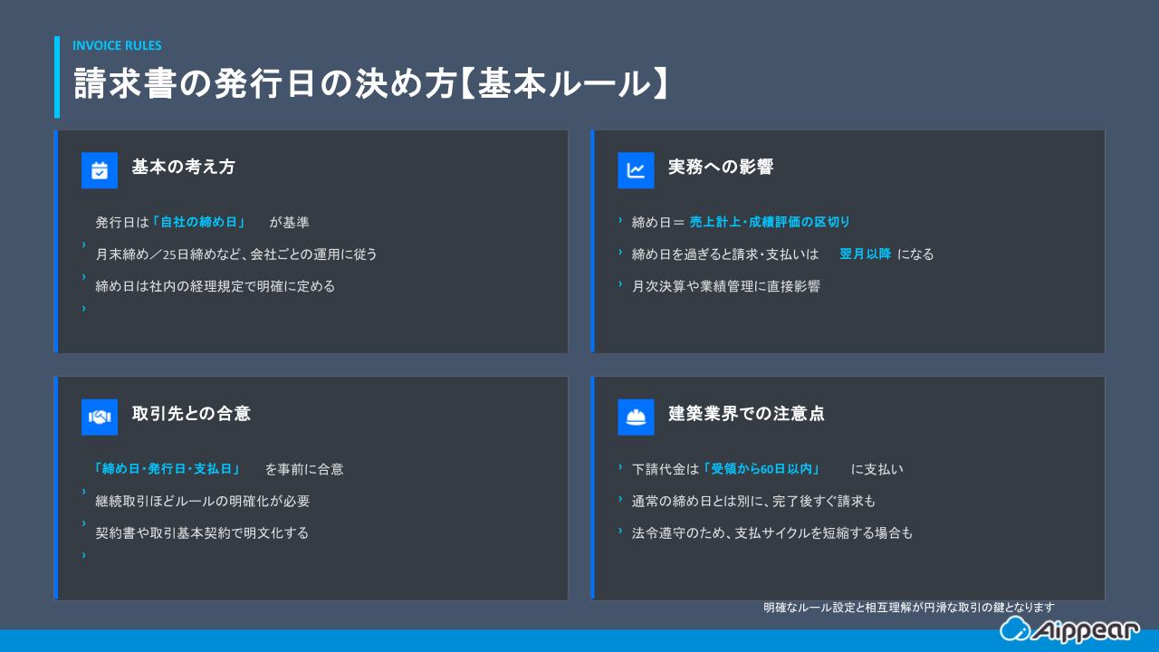 特に掛売取引では、締め日・発行日・支払日を事前に取り決めておくことが重要です。